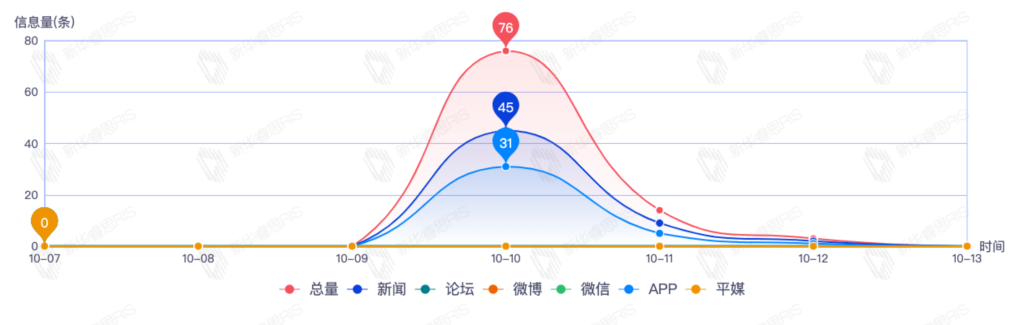 截至目前,該文章在互聯(lián)網(wǎng)上傳播總量93篇。其中10月10日是傳播的高峰期,共傳播76篇文章。各信源的信息發(fā)布情況中,新聞信息占比最大,其次是APP,信息量分別為56、27,占比分別為67.47%、32.53%。(數(shù)據(jù)來源:新華睿思數(shù)據(jù)云圖分析平臺)