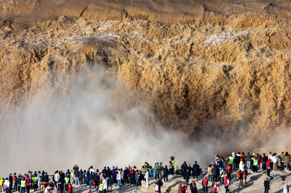 寒露過(guò)后,秋意漸濃。連日來(lái),受上游水庫(kù)調(diào)節(jié)放水影響,位于山西吉縣和陜西宜川縣交界的黃河壺口瀑布水量豐沛,形成綿延百米的壯美瀑布群,吸引眾多游客前來(lái)觀賞。(新華社記者王飛航)
