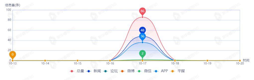截至目前,該文章在互聯(lián)網(wǎng)上傳播總量87篇。其中10月17日是傳播的高峰期,共傳播86篇文章。各信源的信息發(fā)布情況中,新聞信息占比最大,其次是APP和微信,占比分別為65.75%、30.14%、4.11%。(數(shù)據(jù)來(lái)源:新華睿思數(shù)據(jù)云圖分析平臺(tái))
