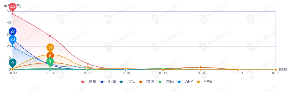 截至目前,該文章在互聯(lián)網(wǎng)上傳播總量86篇。其中10月13日是傳播的高峰期,共傳播48篇文章。各信源的信息發(fā)布情況中,新聞信息占比最大,其次是平媒和APP,占比分別為42.47%、21.92%、20.55%。(數(shù)據(jù)來(lái)源:新華睿思數(shù)據(jù)云圖分析平臺(tái))
