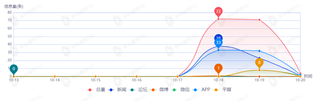截至目前,該文章在互聯(lián)網(wǎng)上傳播總量147篇。其中10月18日是傳播的高峰期,共傳播72篇文章。各信源的信息發(fā)布情況中,新聞信息占比最大,其次是APP和微信,占比分別為48.44%、37.50%、7.03%。(數(shù)據(jù)來(lái)源:新華睿思數(shù)據(jù)云圖分析平臺(tái))