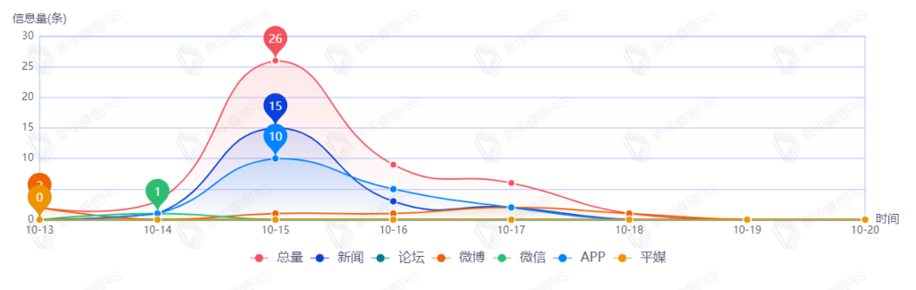 截至目前,該文章在互聯(lián)網(wǎng)上傳播總量47篇。其中10月15日是傳播的高峰期,共傳播26篇文章。各信源的信息發(fā)布情況中,新聞信息占比最大,其次是APP和微博,占比分別為50.00%、30.95%、16.67%。(數(shù)據(jù)來(lái)源:新華睿思數(shù)據(jù)云圖分析平臺(tái))