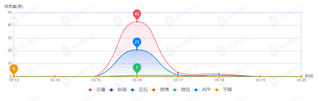截至目前,該文章在互聯(lián)網(wǎng)上傳播總量48篇。其中10月16日是傳播的高峰期,共傳播43篇文章。各信源的信息發(fā)布情況中,新聞信息占比最大,其次是APP和微信,占比分別為58.97%、35.90%、5.13%。(數(shù)據(jù)來(lái)源:新華睿思數(shù)據(jù)云圖分析平臺(tái))