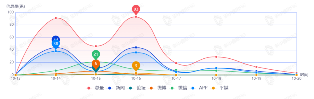 截至目前,該文章在互聯(lián)網(wǎng)上傳播總量294篇。其中10月16日是傳播的高峰期,共傳播93篇文章。各信源的信息發(fā)布情況中,新聞信息占比最大,其次是APP和微信,占比分別為45.53%、27.63%、21.79%。(數(shù)據(jù)來(lái)源:新華睿思數(shù)據(jù)云圖分析平臺(tái))