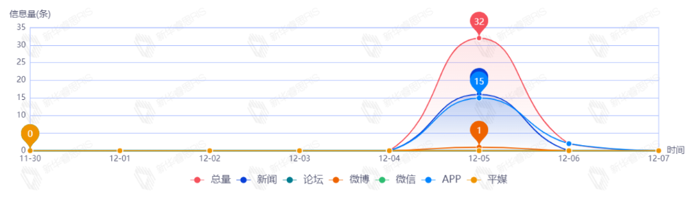截至目前,該文章在互聯(lián)網(wǎng)上傳播總量共34篇。其中,12月5日是傳播的高峰期,共傳播32篇文章。各信源的信息發(fā)布情況中,新聞信息占比最大,其次是APP和微博,占比分別為50.00%、46.88%、3.13%。(數(shù)據(jù)來源:新華睿思·數(shù)媒智慧分析平臺(tái))