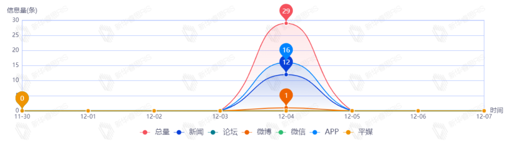 截至目前,該文章在互聯(lián)網(wǎng)上傳播總量共29篇。其中,12月4日是傳播的高峰期,共傳播29篇文章。各信源的信息發(fā)布情況中,新聞信息占比最大,其次是APP和微博,占比分別為50.00%、45.83%、4.17%。(數(shù)據(jù)來源:新華睿思·數(shù)媒智慧分析平臺(tái))