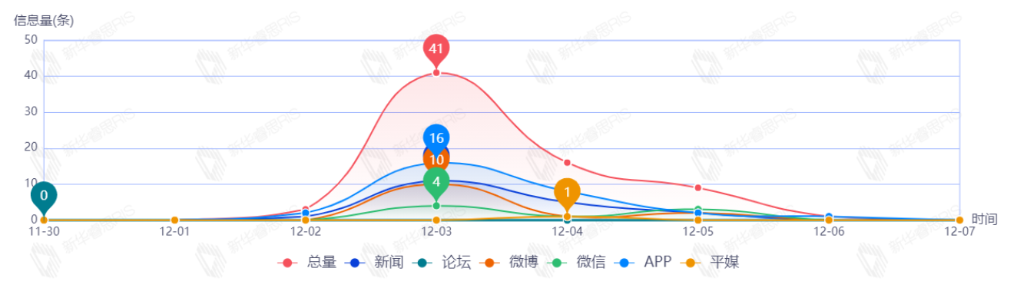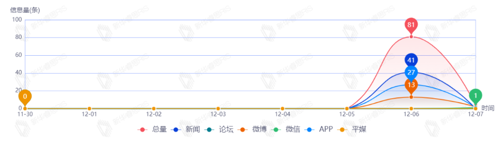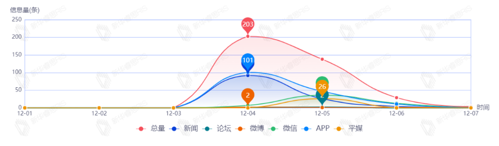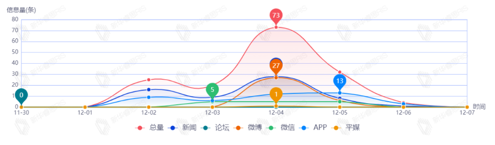 截至目前,該文章在互聯(lián)網(wǎng)上傳播總量共154篇。其中,12月4日是傳播的高峰期,共傳播73篇文章。各信源的信息發(fā)布情況中,新聞信息占比最大,其次是APP和微博,占比分別為42.47%、23.97%、22.60%。(數(shù)據(jù)來源:新華睿思·數(shù)媒智慧分析平臺(tái))