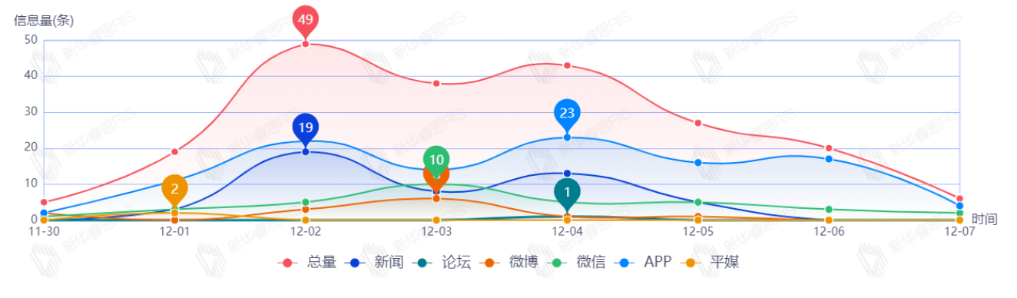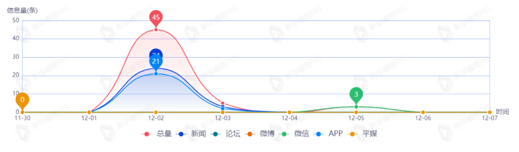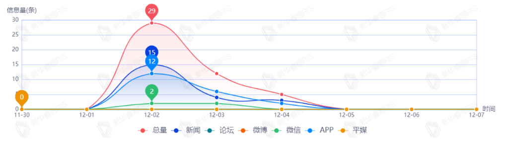 截至目前,該文章在互聯(lián)網(wǎng)上傳播總量共49篇。其中,12月2日是傳播的高峰期,共傳播29篇文章。各信源的信息發(fā)布情況中,新聞信息占比最大,其次是APP和微信,占比分別為51.16%、39.53%、9.30%.(數(shù)據(jù)來源:新華睿思·數(shù)媒智慧分析平臺(tái))