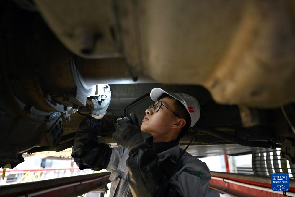 1月9日,动车组机械师在太原动车组运用所检查列车底部。