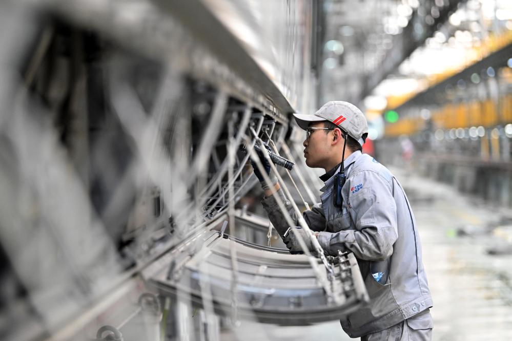 1月9日,在太原动车组运用所,动车组机械师在列车顶部检查维护。