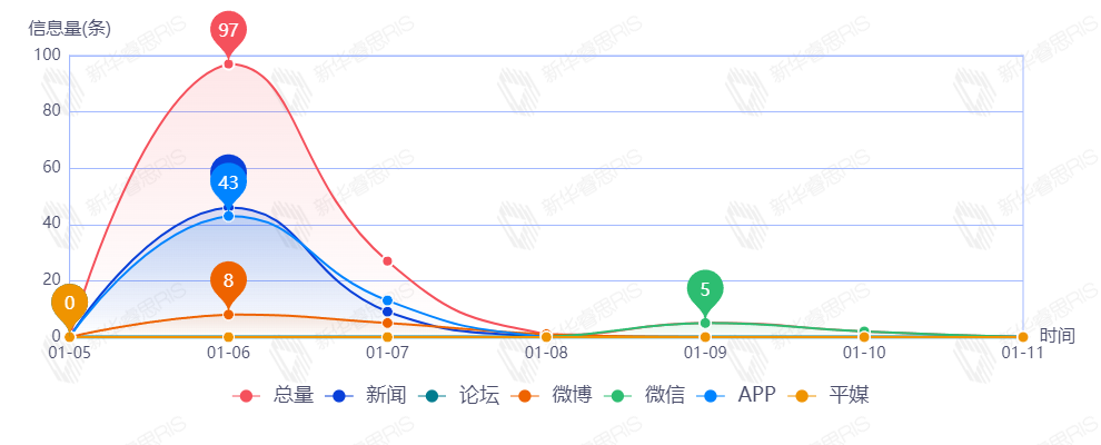 截至目前,該文章在互聯(lián)網(wǎng)上傳播總量132篇。其中1月6日是傳播的高峰期,共傳播97篇文章。各信源的信息發(fā)布情況中,新聞信息占比最大,其次是APP和微博,占比分別為43.21%、41.54%和10.77%。(數(shù)據(jù)來(lái)源:新華睿思數(shù)據(jù)云圖分析平臺(tái))