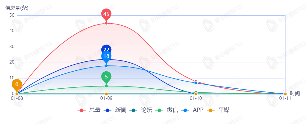 截至目前,該文章在互聯(lián)網(wǎng)上傳播總量53篇。其中1月9日是傳播的高峰期,共傳播45篇文章。各信源的信息發(fā)布情況中,APP占比最大,其次是新聞信息,占比分別為46.15%和42.31%。(數(shù)據(jù)來(lái)源:新華睿思數(shù)據(jù)云圖分析平臺(tái))