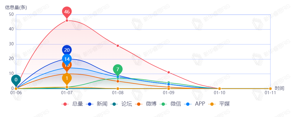 截至目前,該文章在互聯(lián)網(wǎng)上傳播總量86篇。其中1月7日是傳播的高峰期,共傳播46篇文章。各信源的信息發(fā)布情況中,新聞信息占比最大,其次是APP,占比分別為37.21%和29.07%。(數(shù)據(jù)來(lái)源:新華睿思數(shù)據(jù)云圖分析平臺(tái))