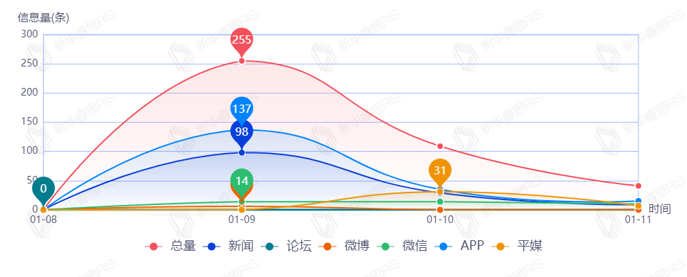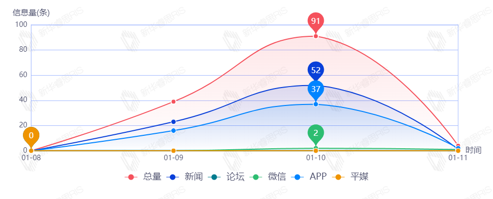 截至目前,該文章在互聯(lián)網(wǎng)上傳播總量134篇。其中1月10日是傳播的高峰期,共傳播91篇文章。各信源的信息發(fā)布情況中,新聞信息占比最大,其次是APP,占比分別為57.58%和40.15%。(數(shù)據(jù)來(lái)源:新華睿思數(shù)據(jù)云圖分析平臺(tái))