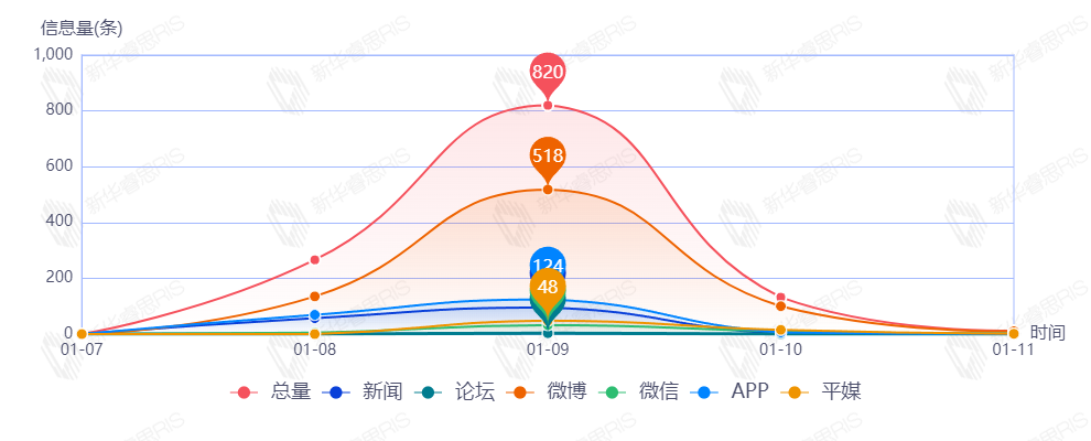 截至目前,該文章在互聯(lián)網(wǎng)上傳播總量1230篇。其中1月9日是傳播的高峰期,共傳播820篇文章。各信源的信息發(fā)布情況中,微博占比最大,其次是APP,占比分別為62.64%和15.35%。(數(shù)據(jù)來(lái)源:新華睿思數(shù)據(jù)云圖分析平臺(tái))
