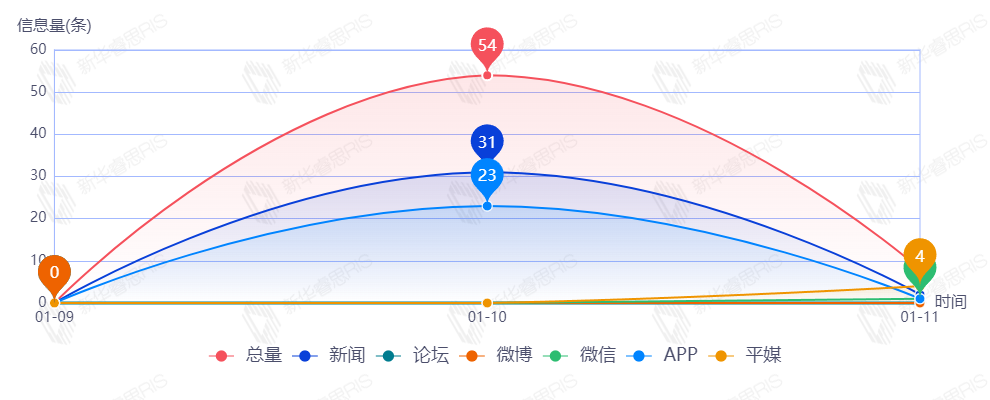 截至目前,該文章在互聯(lián)網(wǎng)上傳播總量62篇。其中1月10日是傳播的高峰期,共傳播54篇文章。各信源的信息發(fā)布情況中,新聞信息占比最大,其次是APP,占比分別為53.23%和38.71%。(數(shù)據(jù)來(lái)源:新華睿思數(shù)據(jù)云圖分析平臺(tái))