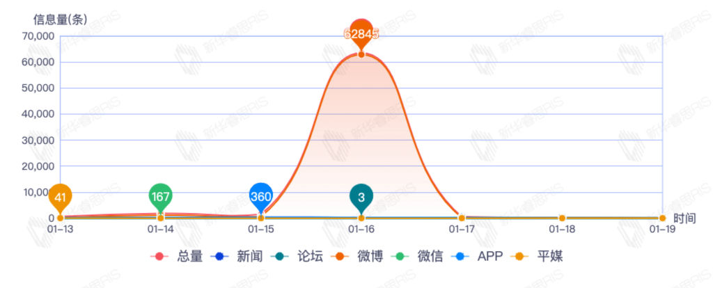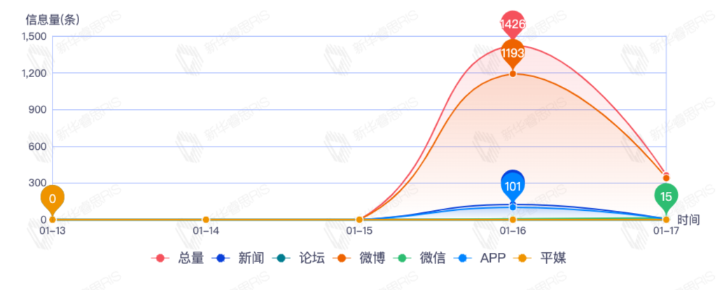 截至目前,該文章在互聯(lián)網(wǎng)上傳播總量1791篇。其中1月16日是傳播的高峰期,共傳播1426篇文章。各信源的信息發(fā)布情況中,微博信息占比最大,其次是新聞和APP,占比分別為85.79%、7.22%、5.76%。(數(shù)據(jù)來源:新華睿思數(shù)據(jù)云圖分析平臺)