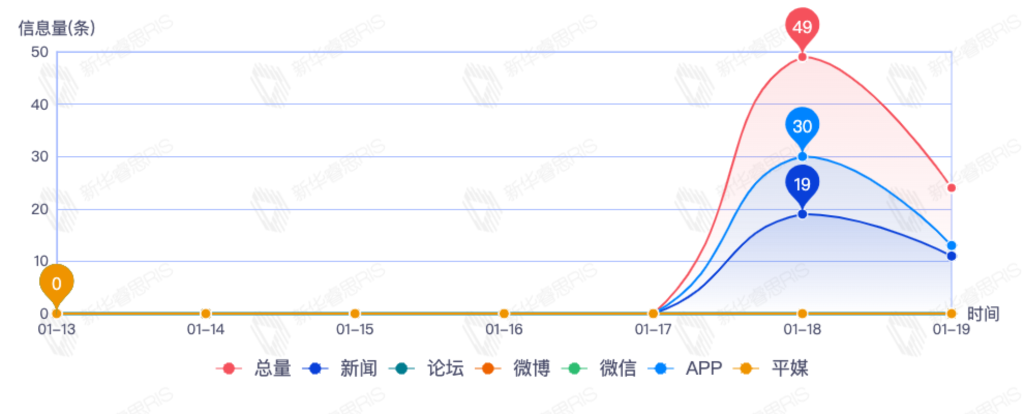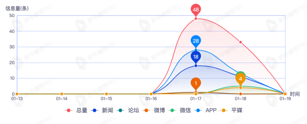 截至目前,該文章在互聯(lián)網(wǎng)上傳播總量81篇。其中1月17日是傳播的高峰期,共傳播48篇文章。各信源的信息發(fā)布情況中,APP信息占比最大,其次是新聞和微信,占比分別為50.62%、35.80%、6.17%。(數(shù)據(jù)來源:新華睿思數(shù)據(jù)云圖分析平臺)