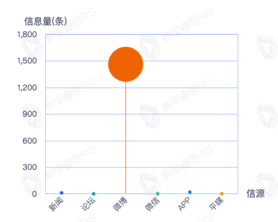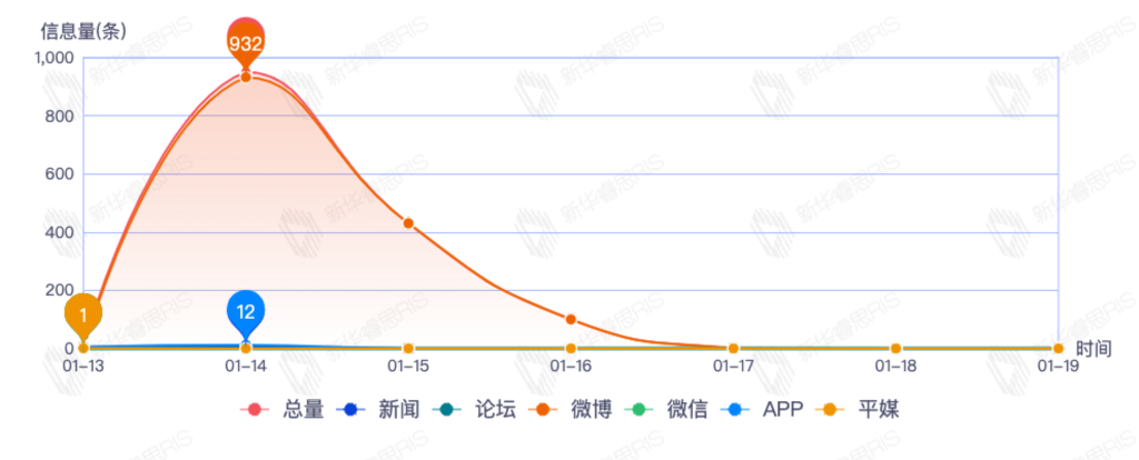 截至目前,該文章在互聯(lián)網(wǎng)上傳播總量1493篇。其中1月14日是傳播的高峰期,共傳播950篇文章。各信源的信息發(fā)布情況中,微博信息占比最大,其次是APP和新聞,占比分別為97.92%、1.21%、0.67%。(數(shù)據(jù)來源:新華睿思數(shù)據(jù)云圖分析平臺)