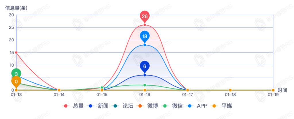 截至目前,該文章在互聯(lián)網(wǎng)上傳播總量42篇。其中1月16日是傳播的高峰期,共傳播26篇文章。各信源的信息發(fā)布情況中,APP信息占比最大,其次是新聞和微信,占比分別為52.63%、23.68%、15.79%。(數(shù)據(jù)來源:新華睿思數(shù)據(jù)云圖分析平臺)