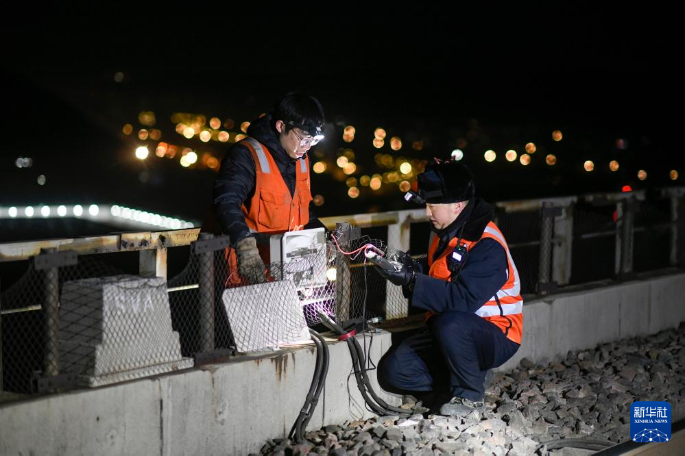 1月21日凌晨,中国铁路太原局集团有限公司太原电务段吕梁车间信号工在检查轨道电路设备。