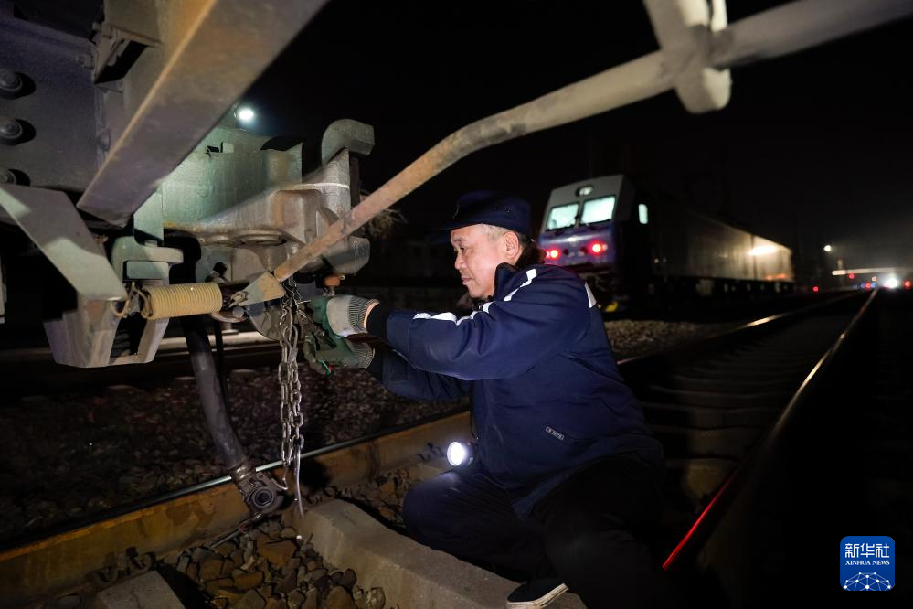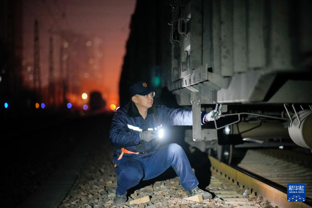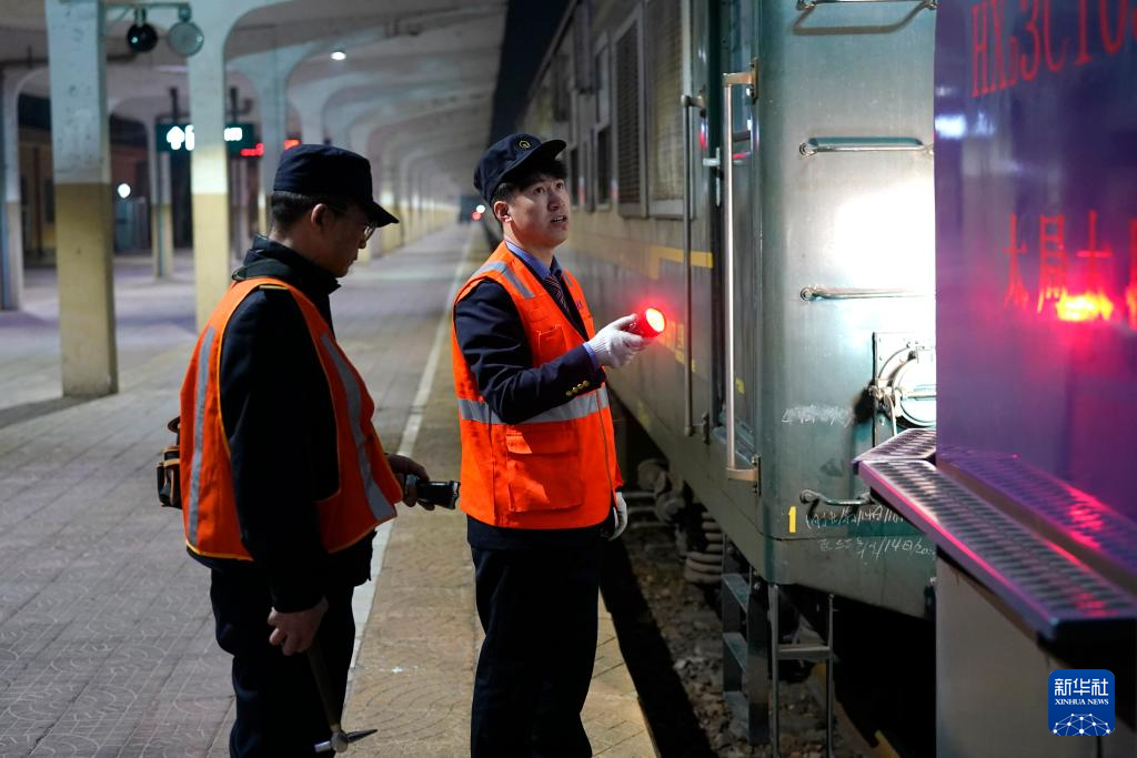 1月19日晚,在山西省运城市运城站,连接员刘泽对列车进行检查。