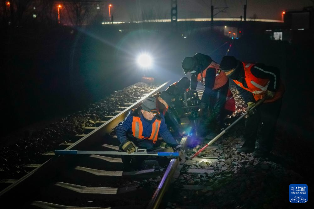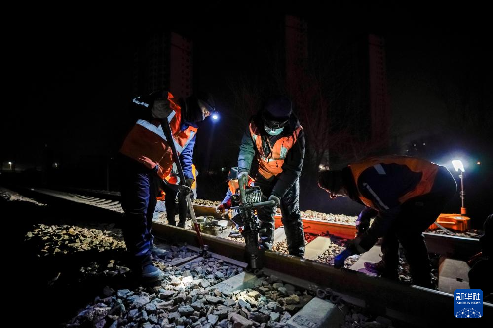 1月20日凌晨,中国铁路太原局集团有限公司侯马北工务段运城线路车间线路工在进行维修作业。