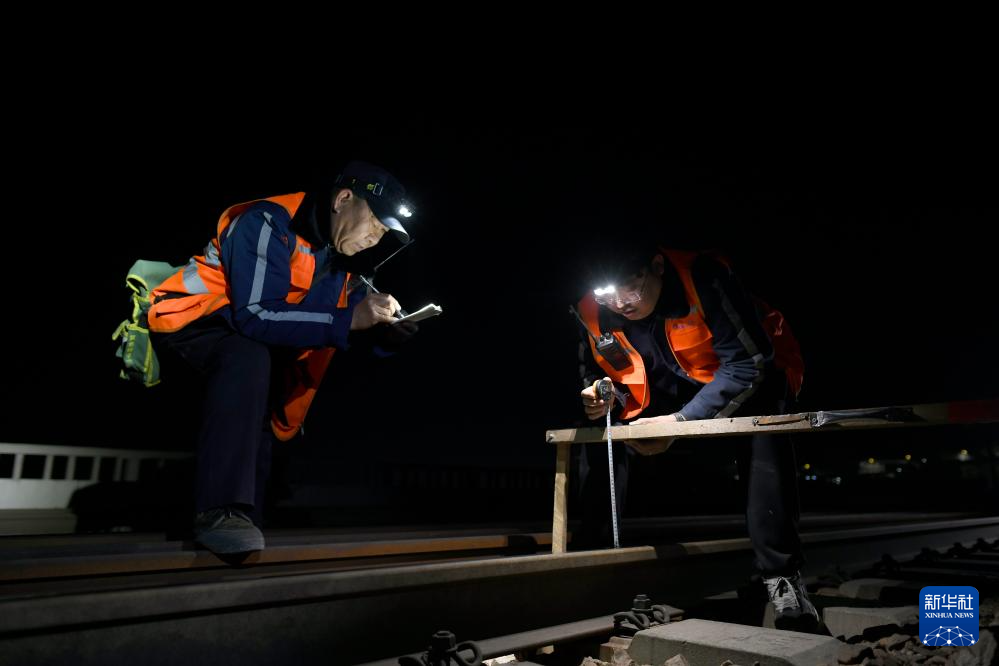 1月21日晚,中国铁路太原局集团有限公司太原南工务段吕梁桥隧车间班长王翔(左)和桥隧工崔锦城在桥梁上检查。