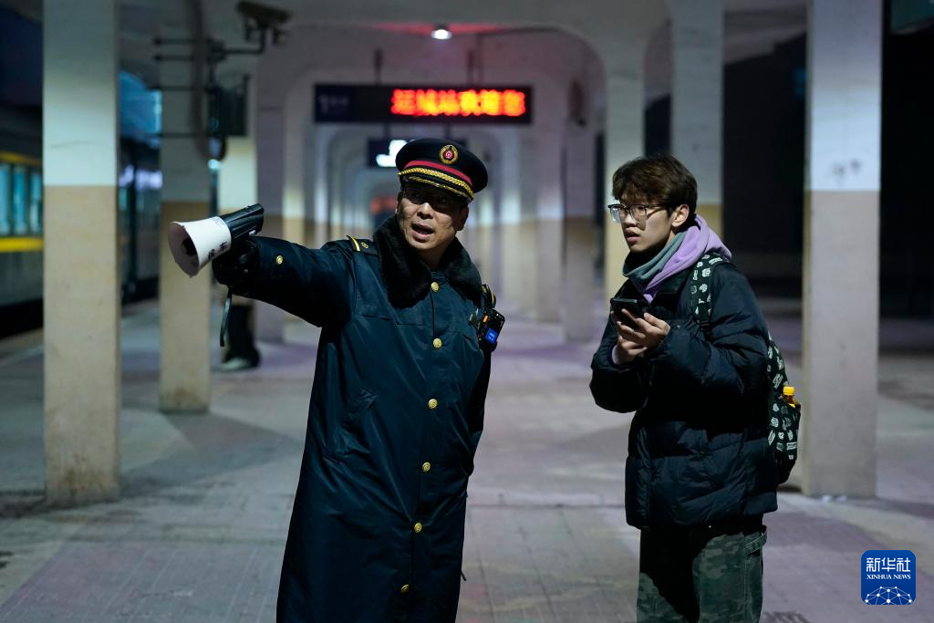 1月20日晚,山西省运城市运城站客运员姜培生(左)在站台为旅客提供服务。