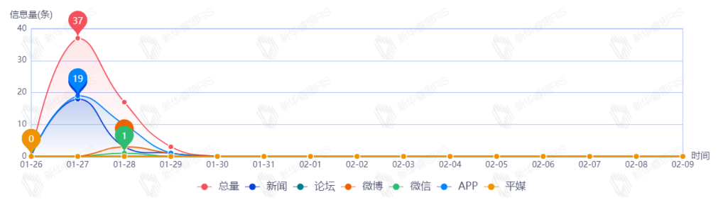 截至目前,該文章在互聯(lián)網(wǎng)上傳播總量57篇。其中1月27日是傳播的高峰期,共傳播37篇文章。各信源的信息發(fā)布情況中,APP信息占比最大,其次是新聞和微博,占比分別為52.63%、38.60%、7.02%。(數(shù)據(jù)來源:新華睿思數(shù)據(jù)云圖分析平臺)