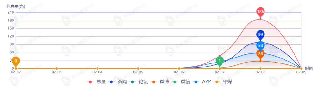 截至目前,該文章在互聯(lián)網(wǎng)上傳播總量233篇。其中2月8日是傳播的高峰期,共傳播185篇文章。各信源的信息發(fā)布情況中,新聞信息占比最大,其次是APP和微博,占比分別為50.86%、36.21%、12.50%。(數(shù)據(jù)來源:新華睿思數(shù)據(jù)云圖分析平臺)