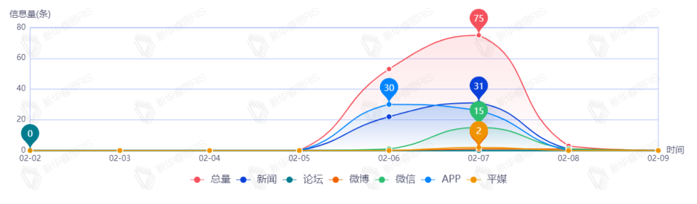 截至目前,該文章在互聯(lián)網(wǎng)上傳播總量131篇。其中2月7日是傳播的高峰期,共傳播75篇文章。各信源的信息發(fā)布情況中,APP信息占比最大,其次是新聞和微信,占比分別為42.75%、41.22%、12.98%。(數(shù)據(jù)來源:新華睿思數(shù)據(jù)云圖分析平臺)
