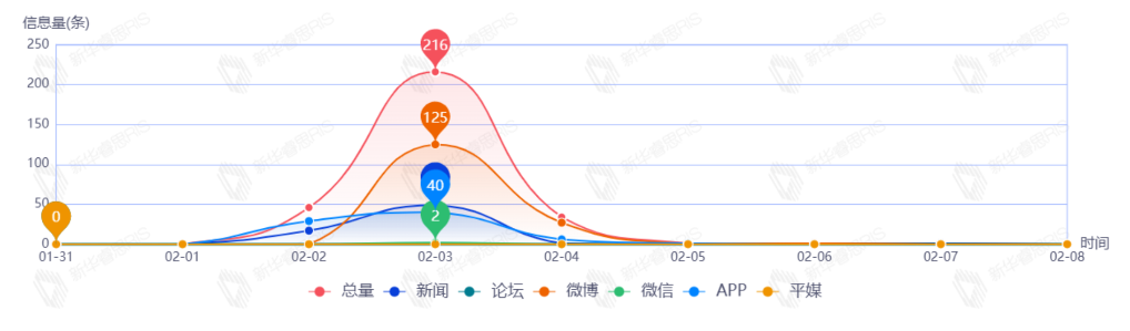 截至目前,該文章在互聯(lián)網(wǎng)上傳播總量307篇。其中2月3日是傳播的高峰期,共傳播216篇文章。各信源的信息發(fā)布情況中,新聞微博占比最大,其次是APP和新聞,占比分別為54.08%、27.80%、18.12%。(數(shù)據(jù)來源:新華睿思數(shù)據(jù)云圖分析平臺)