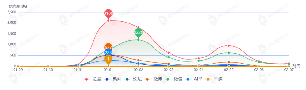 截至目前,該文章在互聯(lián)網(wǎng)上傳播總量3715篇。其中2月1日是傳播的高峰期,共傳播2105篇文章。各信源的信息發(fā)布情況中,微信占比最大,其次是微博和APP,占比分別為43.06%、37.04%、12.96%。(數(shù)據(jù)來源:新華睿思數(shù)據(jù)云圖分析平臺)
