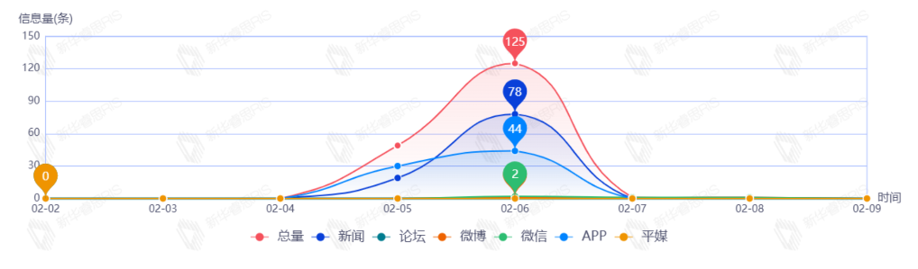 截至目前,該文章在互聯(lián)網(wǎng)上傳播總量214篇。其中2月6日是傳播的高峰期,共傳播125篇文章。各信源的信息發(fā)布情況中,新聞信息占比最大,其次是APP,占比分別為52.73%、47.27%。(數(shù)據(jù)來源:新華睿思數(shù)據(jù)云圖分析平臺)