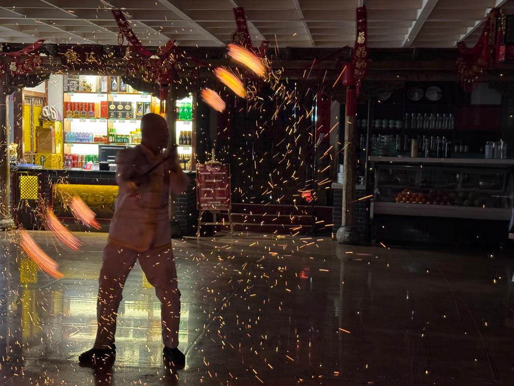 贾天仓在饭店表演已有多年。风火流星从“逢年过节耍一耍”到“常态化表演”的转变离不开他的创新意识。