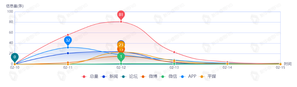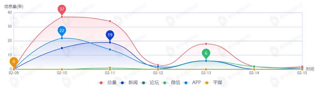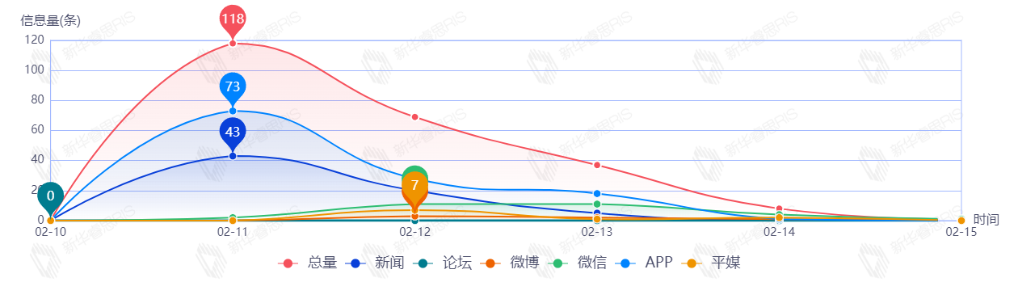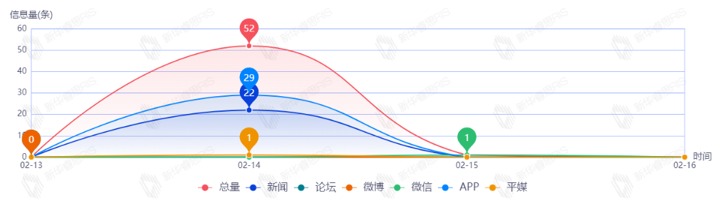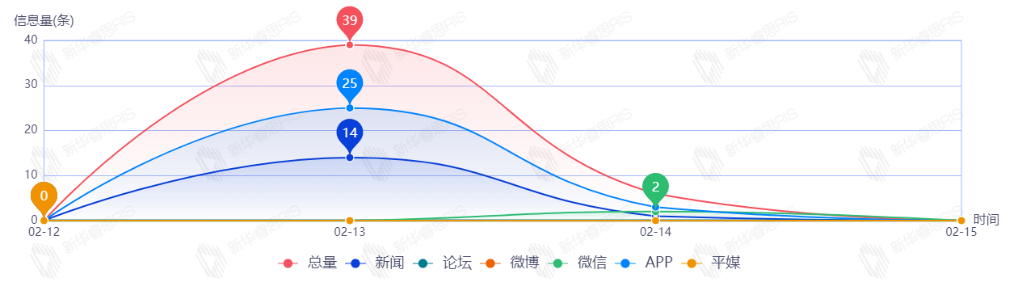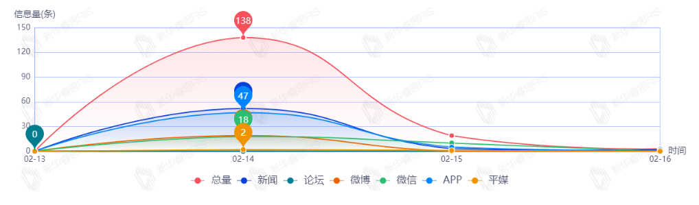 截至目前,該文章在互聯(lián)網(wǎng)上傳播總量160篇。其中2月14日是傳播的高峰期,共傳播138篇文章。各信源的信息發(fā)布情況中,新聞信息占比最大,其次是APP和微信,占比分別為35.63%、33.13%、17.50%。(數(shù)據(jù)來源:新華睿思數(shù)據(jù)云圖分析平臺(tái))