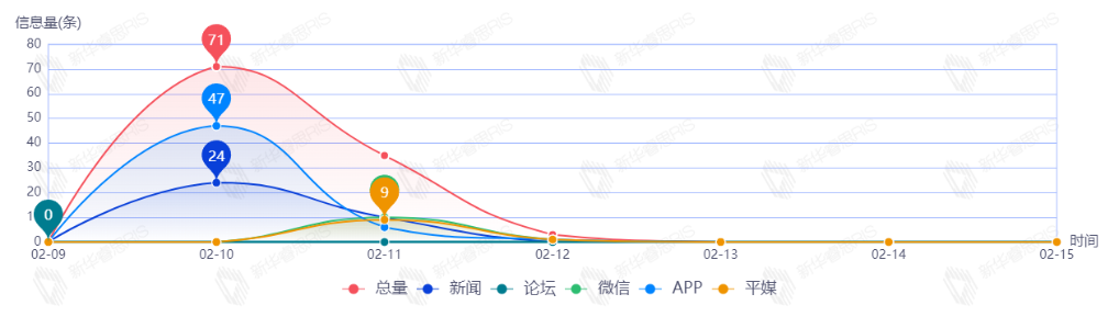 截至目前,該文章在互聯(lián)網(wǎng)上傳播總量109篇。其中2月10日是傳播的高峰期,共傳播71篇文章。各信源的信息發(fā)布情況中,APP信息占比最大,其次是新聞和微信,占比分別為49.54%、31.19%、10.09%。(數(shù)據(jù)來源:新華睿思數(shù)據(jù)云圖分析平臺(tái))