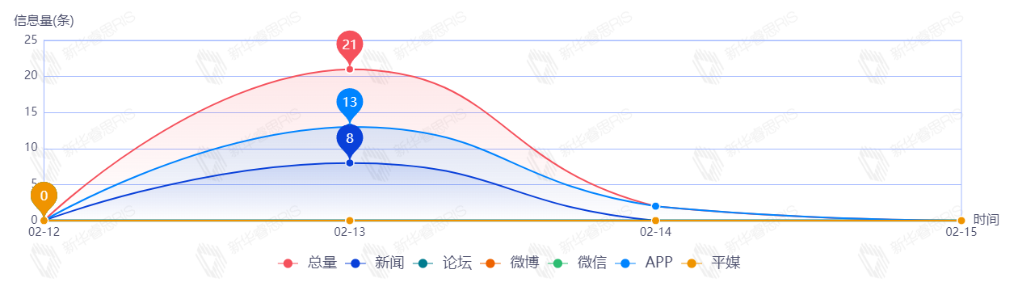 截至目前,該文章在互聯(lián)網(wǎng)上傳播總量23篇。其中2月13日是傳播的高峰期,共傳播21篇文章。各信源的信息發(fā)布情況中,新聞信息占比最大,其次是APP和微博,占比分別為43.21%、41.54%和10.77%。(數(shù)據(jù)來源:新華睿思數(shù)據(jù)云圖分析平臺(tái))