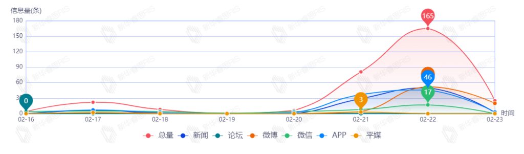 截至目前,該文章在互聯(lián)網(wǎng)上傳播總量共348篇。其中,2月22日是傳播的高峰期,共傳播165篇文章。各信源的信息發(fā)布情況中,APP信息占比最大,其次是新聞和微博,占比分別為32.56%、27.67%、25.07%(數(shù)據(jù)來源:新華睿思·數(shù)媒智慧分析平臺)
