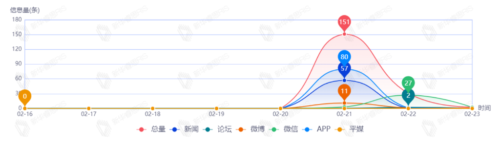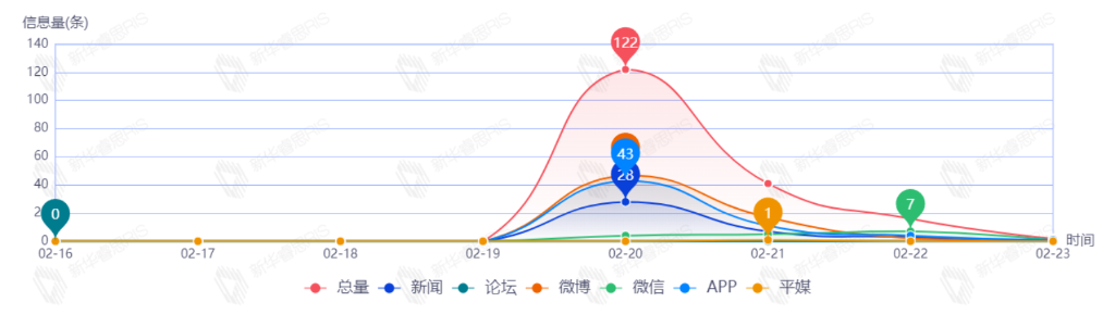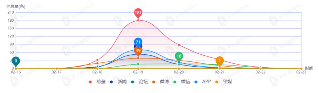 截至目前,該文章在互聯(lián)網(wǎng)上傳播總量共181篇。其中,2月20日是傳播的高峰期,共傳播122篇文章。各信源的信息發(fā)布情況中,微博信息占比最大,其次是APP和新聞,占比分別為36.46%、32.60%、20.99%。(數(shù)據(jù)來源:新華睿思·數(shù)媒智慧分析平臺)