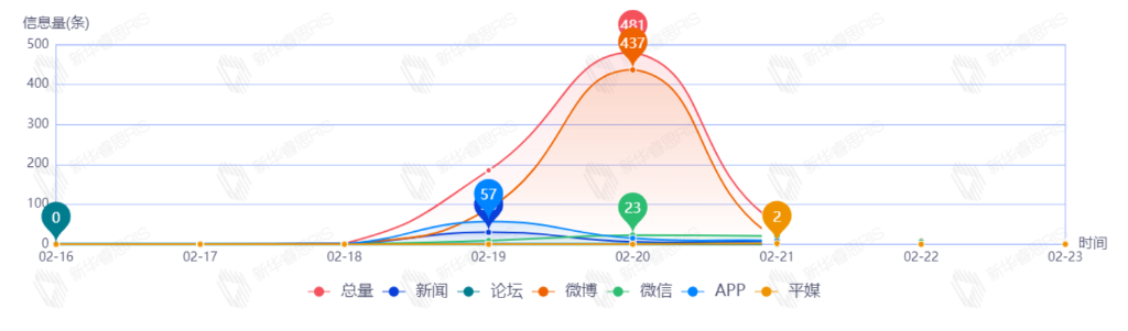 截至目前,該文章在互聯(lián)網(wǎng)上傳播總量共733篇。其中,2月20日是傳播的高峰期,共傳播481篇文章。各信源的信息發(fā)布情況中,微博信息占比最大,其次是APP和微信,占比分別為74.42%、11.22%、8.07%。(數(shù)據(jù)來源:新華睿思·數(shù)媒智慧分析平臺)