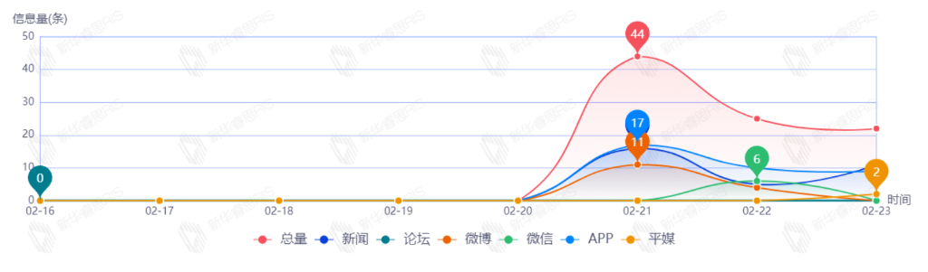 截至目前,該文章在互聯(lián)網(wǎng)上傳播總量共544篇。其中,2月23日是傳播的高峰期,共傳播165篇文章。各信源的信息發(fā)布情況中,APP信息占比最大,其次是新聞和微信,占比分別為43.03%、34.15%、17.60%。(數(shù)據(jù)來源:新華睿思·數(shù)媒智慧分析平臺)