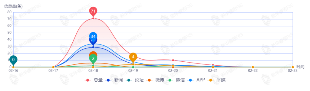 截至目前,該文章在互聯(lián)網(wǎng)上傳播總量共101篇。其中,2月18日是傳播的高峰期,共傳播71篇文章。各信源的信息發(fā)布情況中,APP信息占比最大,其次是新聞和平媒,占比分別為45.54%、37.62%、5.94%。(數(shù)據(jù)來源:新華睿思·數(shù)媒智慧分析平臺)