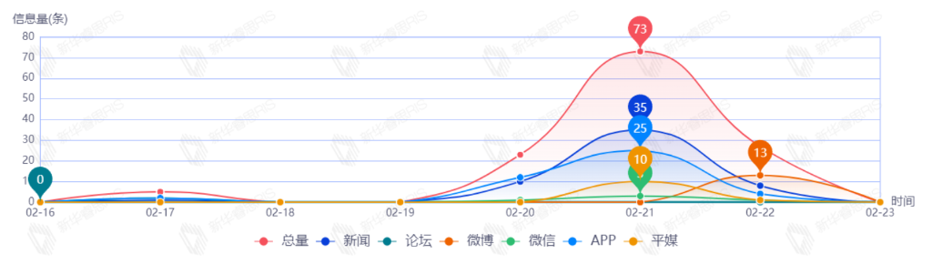 截至目前,該文章在互聯(lián)網(wǎng)上傳播總量共128篇。其中,2月21日是傳播的高峰期,共傳播73篇文章。各信源的信息發(fā)布情況中,新聞信息占比最大,其次是APP和微博,占比分別為42.19%、33.59%、10.16%。(數(shù)據(jù)來源:新華睿思·數(shù)媒智慧分析平臺)