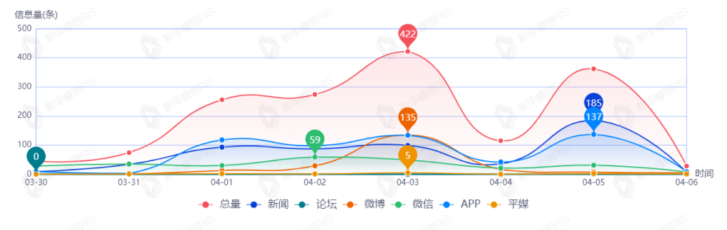 截至目前,該文章在互聯(lián)網(wǎng)上傳播總量1578篇。其中4月3日是傳播的高峰期,共傳播422篇文章。各信源的信息發(fā)布情況中,新聞信息占比最大,其次是APP和微信,占比分別為34.81%、34.81%、16.55%。(數(shù)據(jù)來源:新華睿思數(shù)據(jù)云圖分析平臺)