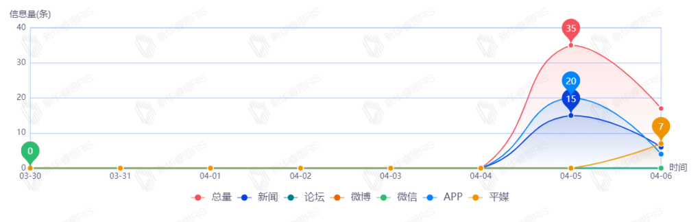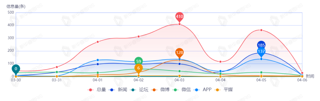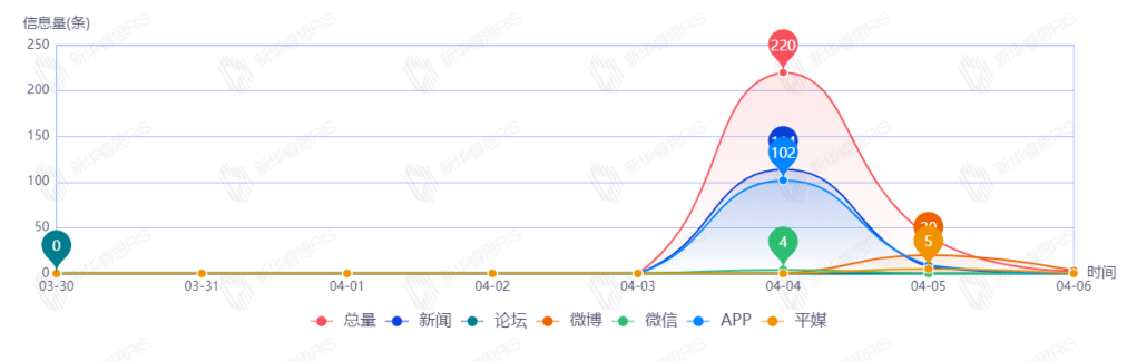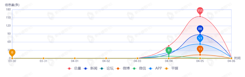 截至目前,該文章在互聯(lián)網(wǎng)上傳播總量205篇。其中4月5日是傳播的高峰期,共傳播155篇文章。各信源的信息發(fā)布情況中,新聞信息占比最大,其次是APP和微博,占比分別為51.71%、37.56%、6.34%。(數(shù)據(jù)來源:新華睿思數(shù)據(jù)云圖分析平臺)
