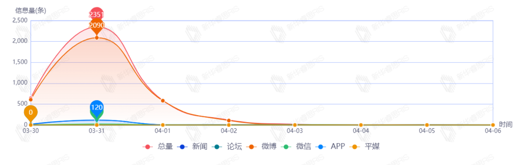截至目前,該文章在互聯(lián)網(wǎng)上傳播總量3725篇。其中3月31日是傳播的高峰期,共傳播2351篇文章。各信源的信息發(fā)布情況中,微博信息占比最大,其次是APP和新聞,占比分別為90.93%、4.08%、3.73%。(數(shù)據(jù)來源:新華睿思數(shù)據(jù)云圖分析平臺)