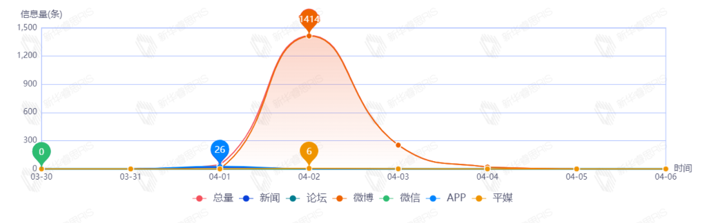 截至目前,該文章在互聯(lián)網(wǎng)上傳播總量1738篇。其中4月2日是傳播的高峰期,共傳播1420篇文章。各信源的信息發(fā)布情況中,微博信息占比最大,其次是APP和新聞,占比分別為97.07%、1.50%、1.04%。(數(shù)據(jù)來源:新華睿思數(shù)據(jù)云圖分析平臺)