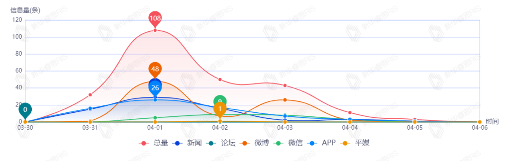截至目前,該文章在互聯(lián)網(wǎng)上傳播總量247篇。其中4月1日是傳播的高峰期,共傳播108篇文章。各信源的信息發(fā)布情況中,微博信息占比最大,其次是APP和新聞,占比分別為34.41%、28.34%、26.72%。(數(shù)據(jù)來源:新華睿思數(shù)據(jù)云圖分析平臺)